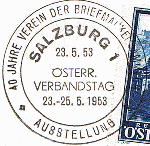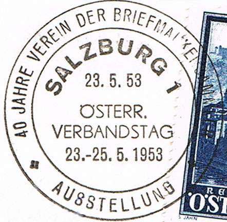 Textinhalt bei Gelegenheitsstempel: ♦ 40 JAHRE VEREIN DER BRIEFMARKENSAMMLER ♦ / AUSSTELLUNG / ÖSTERR. / VERBANDSTAG / 23.-25. 5. 1953