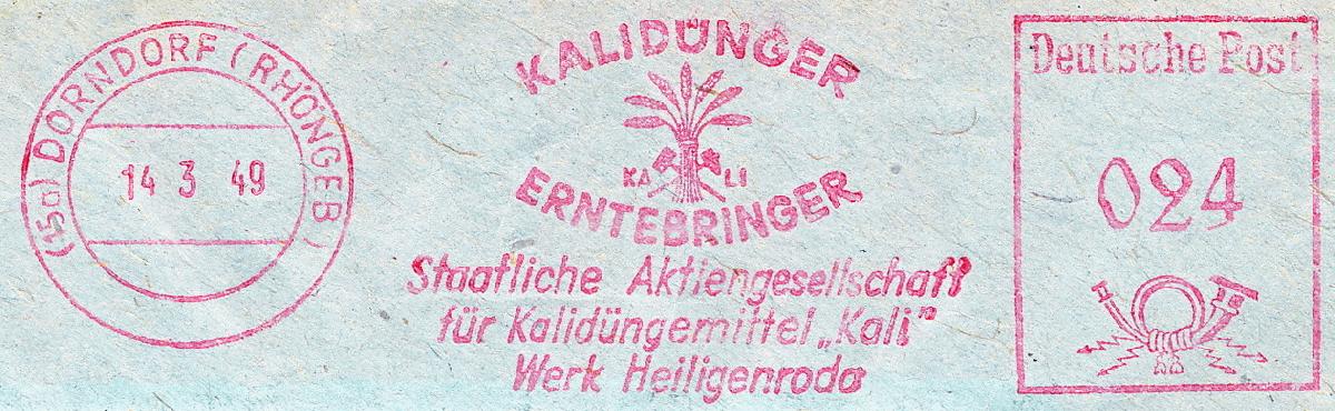 Textinhalt im Werbeklischee: KALIDÜNGER / KALI / ERNTEBRINGER / Staatliche Aktiengesellschaft / für Kalidüngemittel "Kali" / Werk Heiligenrode