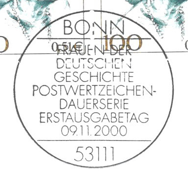 Textinhalt bei Gelegenheitsstempel: FRAUEN DER / DEUTSCHEN / GESCHICHTE / POSTWERTZEICHEN- / DAUERSERIE / ERSTAUSGABETAG