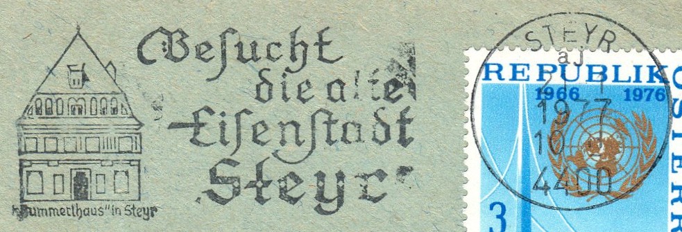 Textinhalt bei Gelegenheitsstempel: Besucht / die alte / Eisenstadt / Steyr / "Bummerlhaus" in Steyr