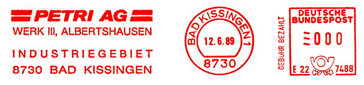Textinhalt im Werbeklischee: PETRI AG / WERK III, ALBERTSHAUSEN / INDUSTRIEGEBIET / 8730 BAD KISSINGEN
