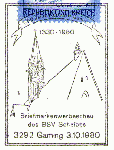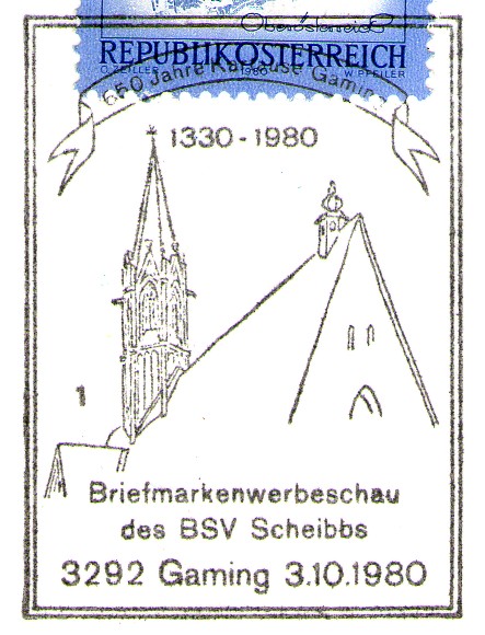 Textinhalt bei Gelegenheitsstempel: 650 Jahre Kartause Gaming / 1330 - 1980 / Briefmarkenwerbeschau / des BSV Scheibbs