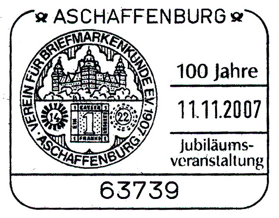 VEREIN FÜR BRIEFMARKENKUNDE E.V. 1907 / ● ASCHAFFENBURG ● / 100 Jahre / Jubiläums- / veranstaltung