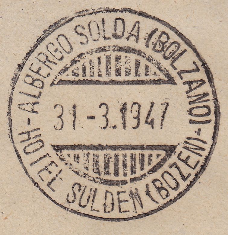 Stempeltext: ALBERGO SOLDA (BOLZANO) / - HOTEL SULDEN (BOZEN) -