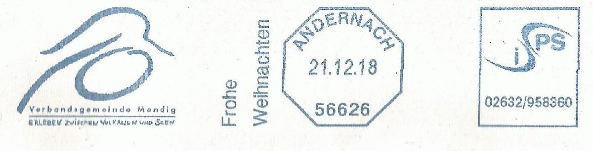 Postfreistempel der IPS gGmbH, Augsbergweg 10, 56626 Andernach für den Kunden Verbandsgemeindeverwaltung Mondig mit re. weiterer Eigenwerbung anstelle des Wertstempels: "PS / i / 02632/958360"