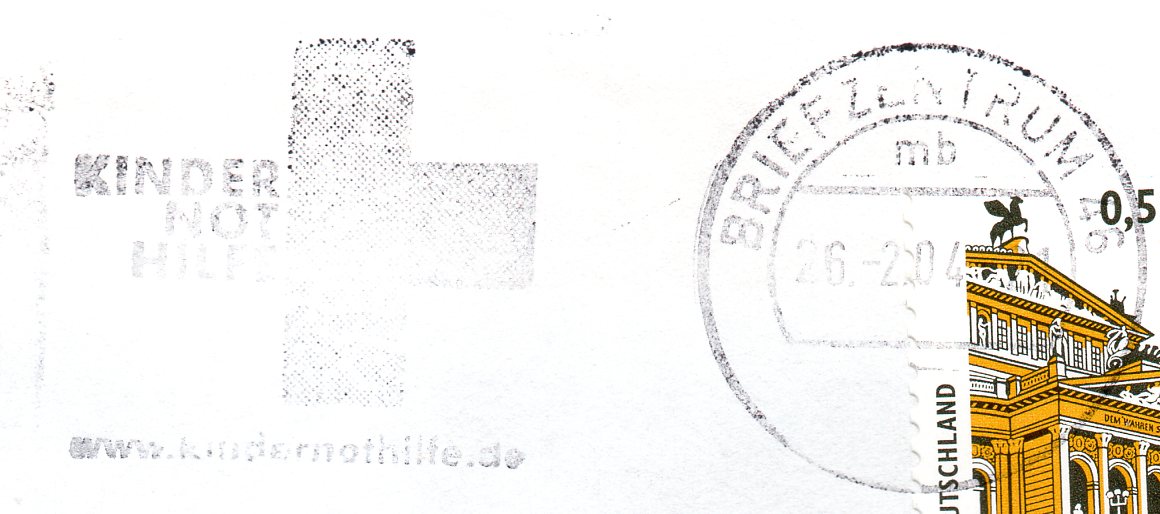 Textinhalt bei Gelegenheitsstempel: KINDER / NOT / HILFE / www.kindernothilfe.de