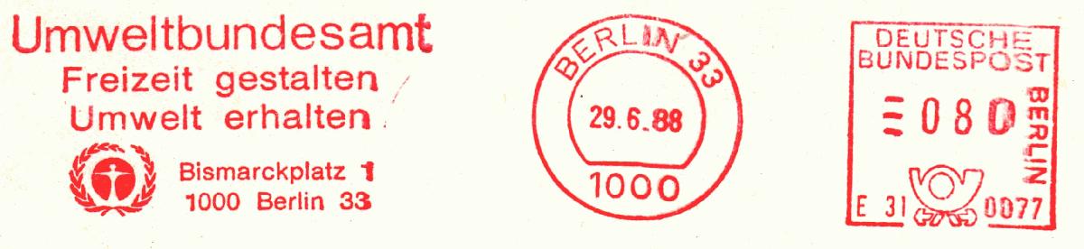 Textinhalt im Werbeklischee: Umweltbundesamt / Freizeit gestalten / Umwelt erhalten / Bismarckplatz 1 / 1000 Berlin 33