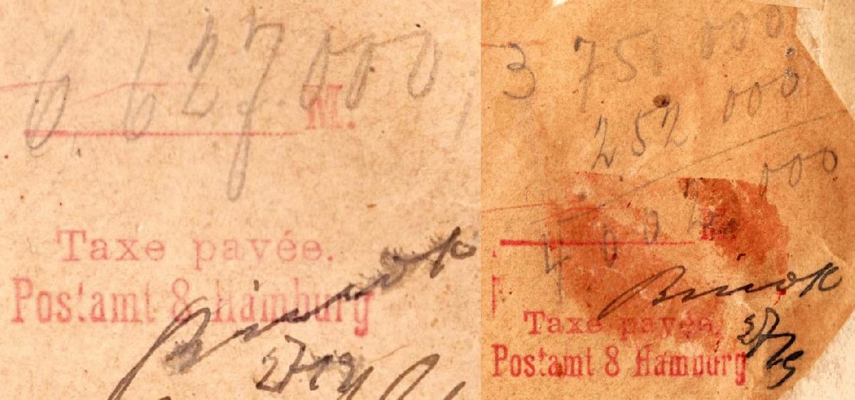Roter vierzeiliger "Taxe payée"-Stempel ........................................ M. / / Taxe payée. / Postamt 8 Hamburg mit ca. 40 Strichpunkten vor dem M. und Leerzeile für Signaturen zwischen der 1. und der 3. Zeile.