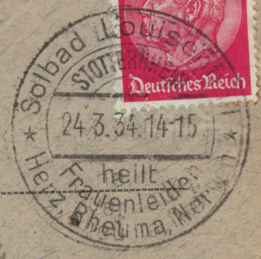 Textinhalt bei Gelegenheitsstempel: * Solbad Louisenhall * / heilt / Frauenleiden / Herz, Rheuma, Nerven