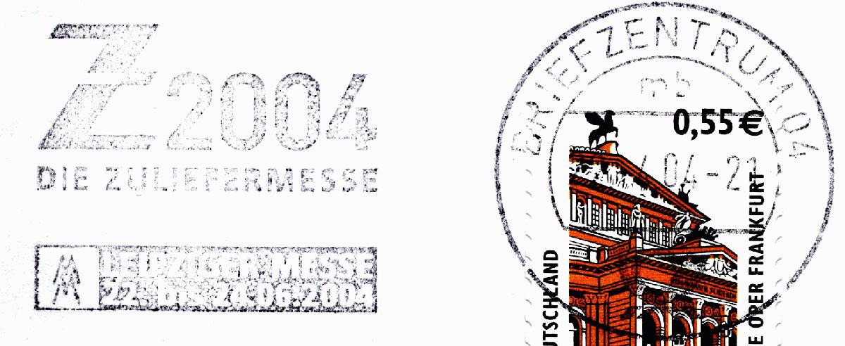 Textinhalt bei Gelegenheitsstempel: Z 2004 / DIE ZULIEFERMESSE / LEIPZIGER MESSE / 22. bis 24.06.2004
