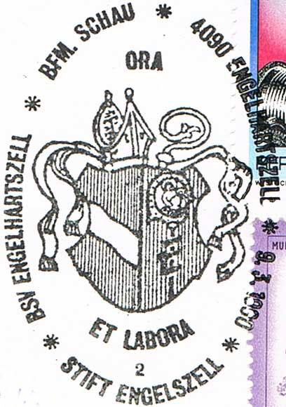 Textinhalt bei Gelegenheitsstempel: * BSV ENGELHARTSZELL * BFM. SCHAU * / STIFT ENGELSZELL* / ORA / ET LABORA