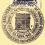 Textinhalt bei Gelegenheitsstempel: ♦ BRIEFMARKENSCHAU DES BC-WACHAU ♦ / ● 1500 ● JAHRE ● ST ● SEVERIN ● + 8.JANUAR 482 ● FAVIANIS ● / BURGUS