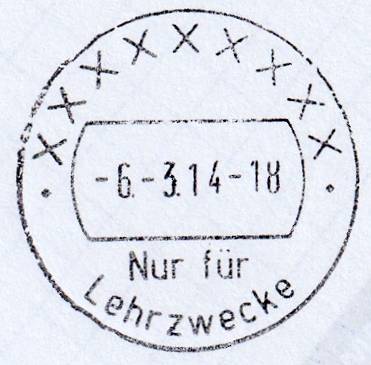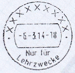 Dieser Stempel war auf der Briefmarkenmesse in München vom 6. bis 8.3.2014 mit fester Datumseinstellung im Kinderpostamt zum Üben von Stempelabschlägen eingesetzt.