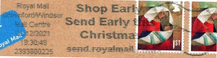 Textinhalt bei Gelegenheitsstempel: Shop Early, / Send Early this / Christmas / send.royalmail.com